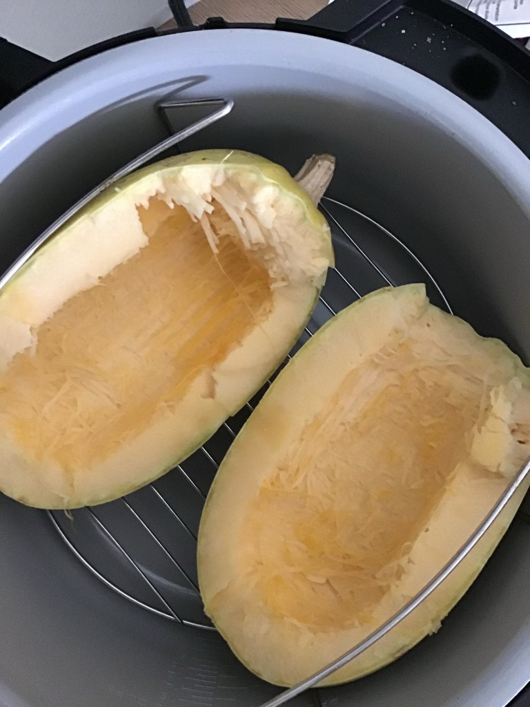 Basically you want to bake it at 350F for about 30 minutes. I usually do not add any oil or salt or seasoning even though I’ve seen some recipes call for it. My goal is to keep it simple in its purest form. And I prefer to bake my squash in my countertop toaster oven and avoid having to heat the entire conventional oven. If you have a multi-cooker, you can bake it in there too…but just be sure to use the bake setting and check often to avoid overcooking it.