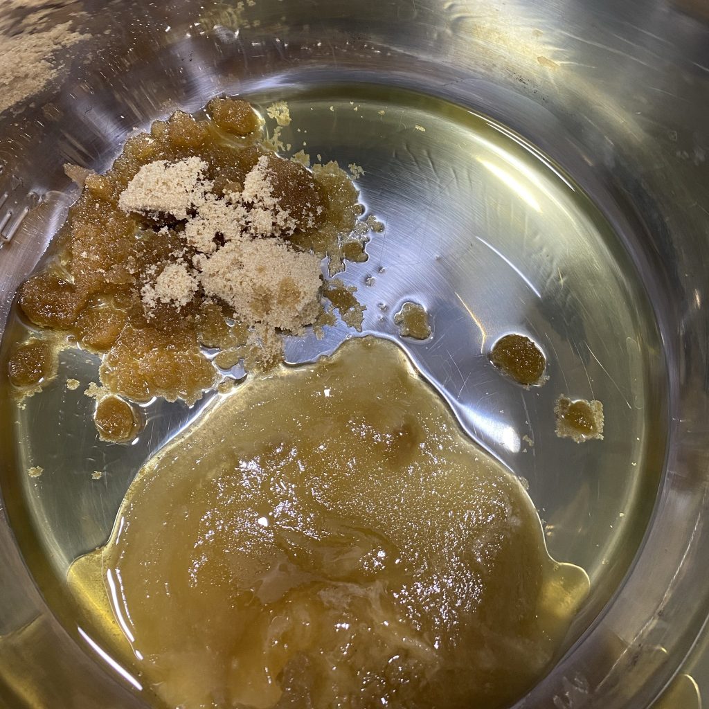 - Add in Oil, Honey and Brown sugar. Stir until the sugar has completed dissolved in the liquid mixture.