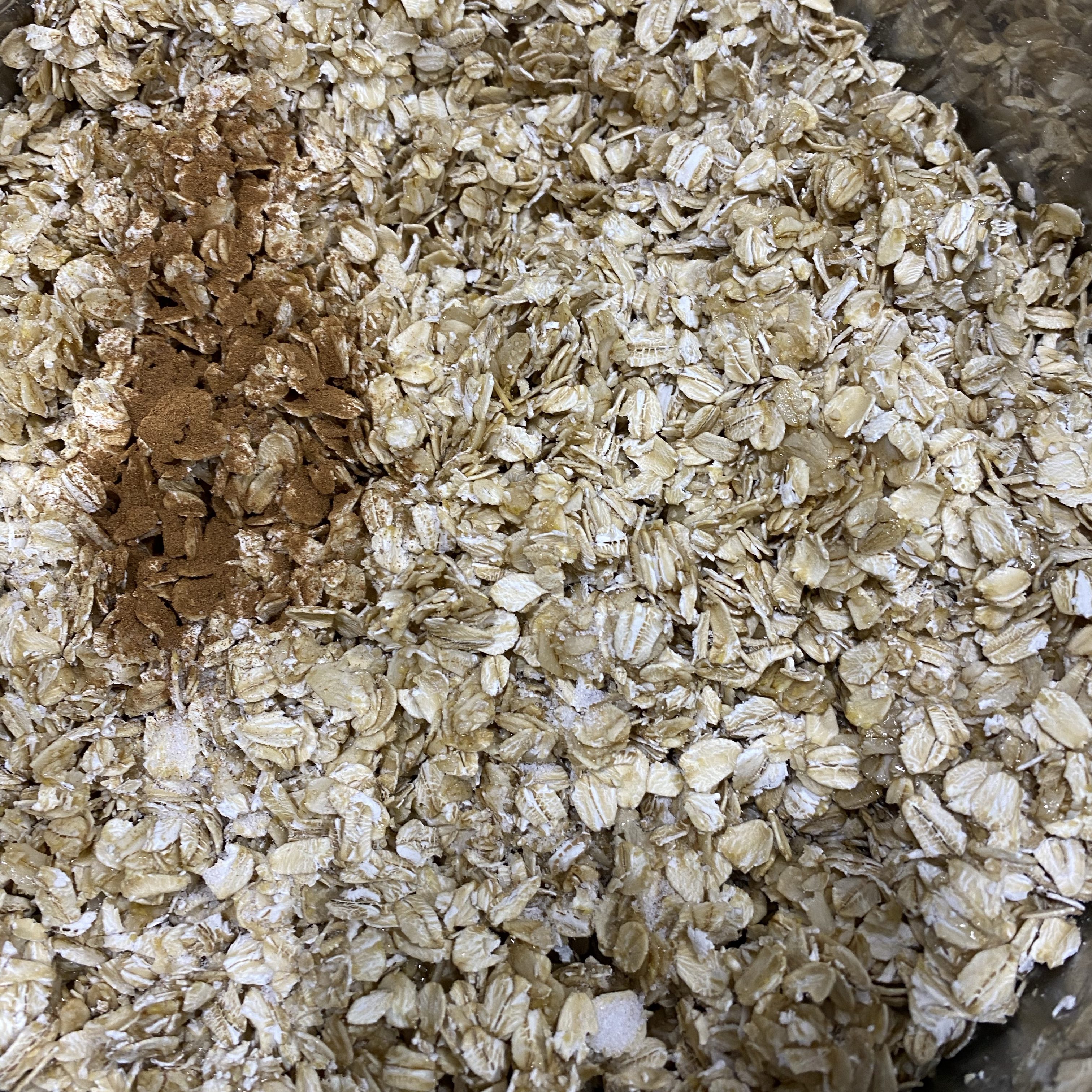 - In a separate mixing bowl, add Oats, Cinnamon Powder and Salt. Add in the liquid mixture and stir well until the oats have been fully coated