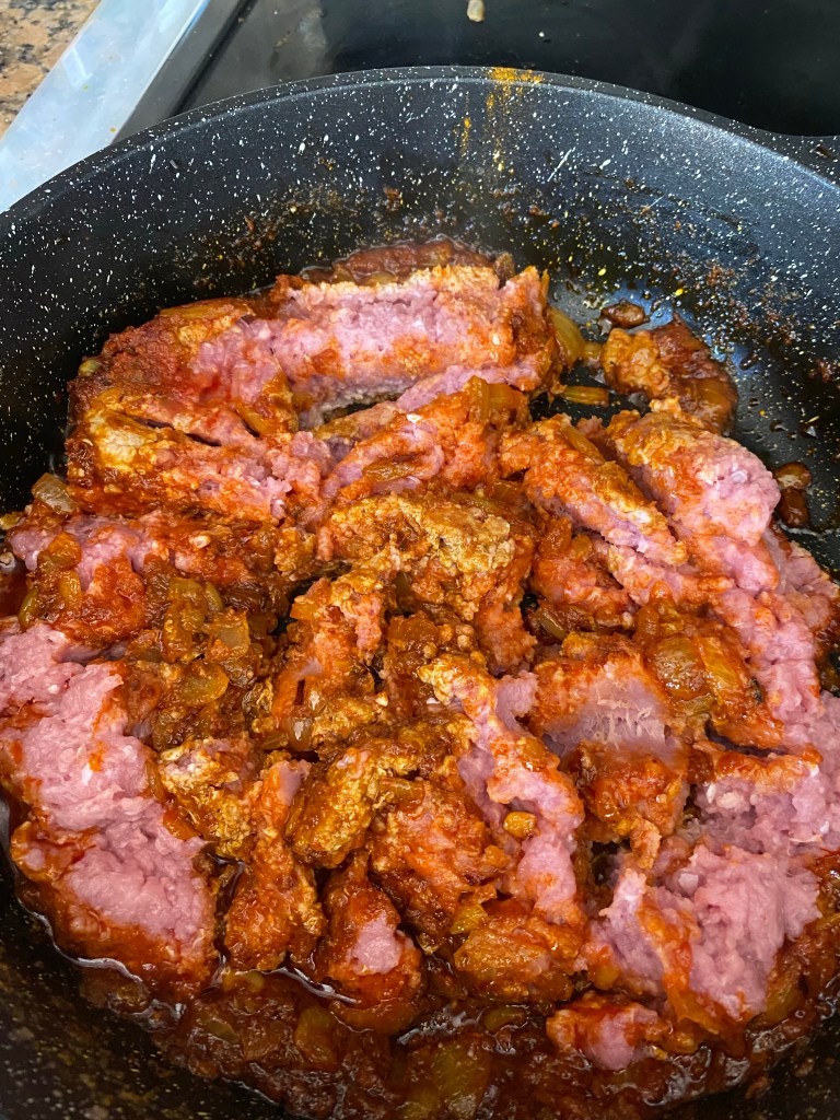 - Finally, I add about 2 pounds of ground turkey and stir it well to distribute the flavors well into the meat and to break up the meat. Cover the pan and let the meat cook well. Stir as needed. If there is too much liquid, open the lid and cook on high heat for a few minutes to let it evaporate a little. Keep stirring.