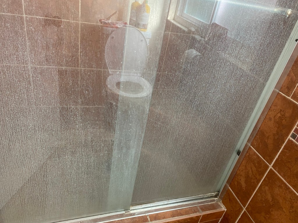 After the cleaner has been sitting around for a few minutes, all you need to do is rinse it off thoroughly. I think I just cleaned our bathroom counters while letting it soak. Thankfully we have a hand held shower head that I was able to use to hose down and get to every nook and cranny of the sliding glass doors and also the shower tiles inside.