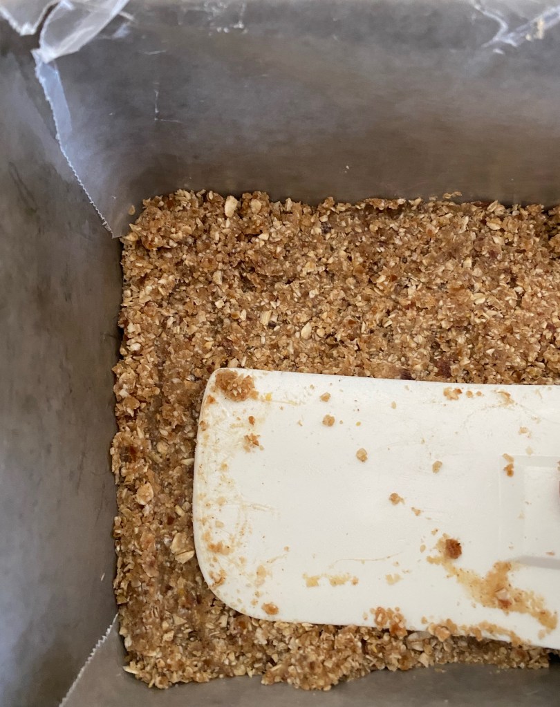 Now I just had to prep them into bars. I lined a loaf pan and pressed in my oat mixture pretty well. I used a flexible spatula to help press down and flatten as much as I could.
