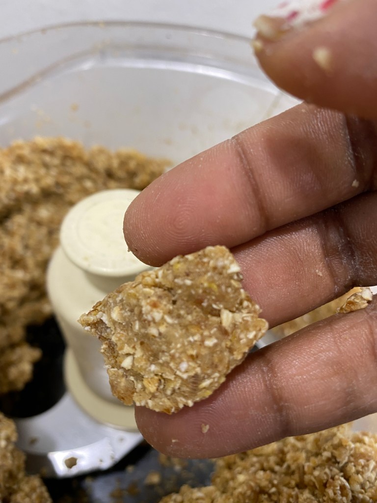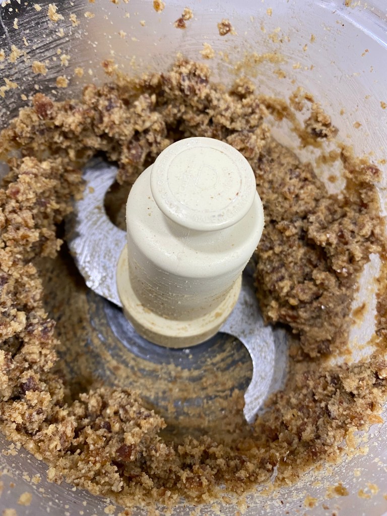 Next I added in 1 tightly packed cup of pitted dates (about 17-18 dates) and processed it with the walnuts. I was happy with the resulting paste like texture.
